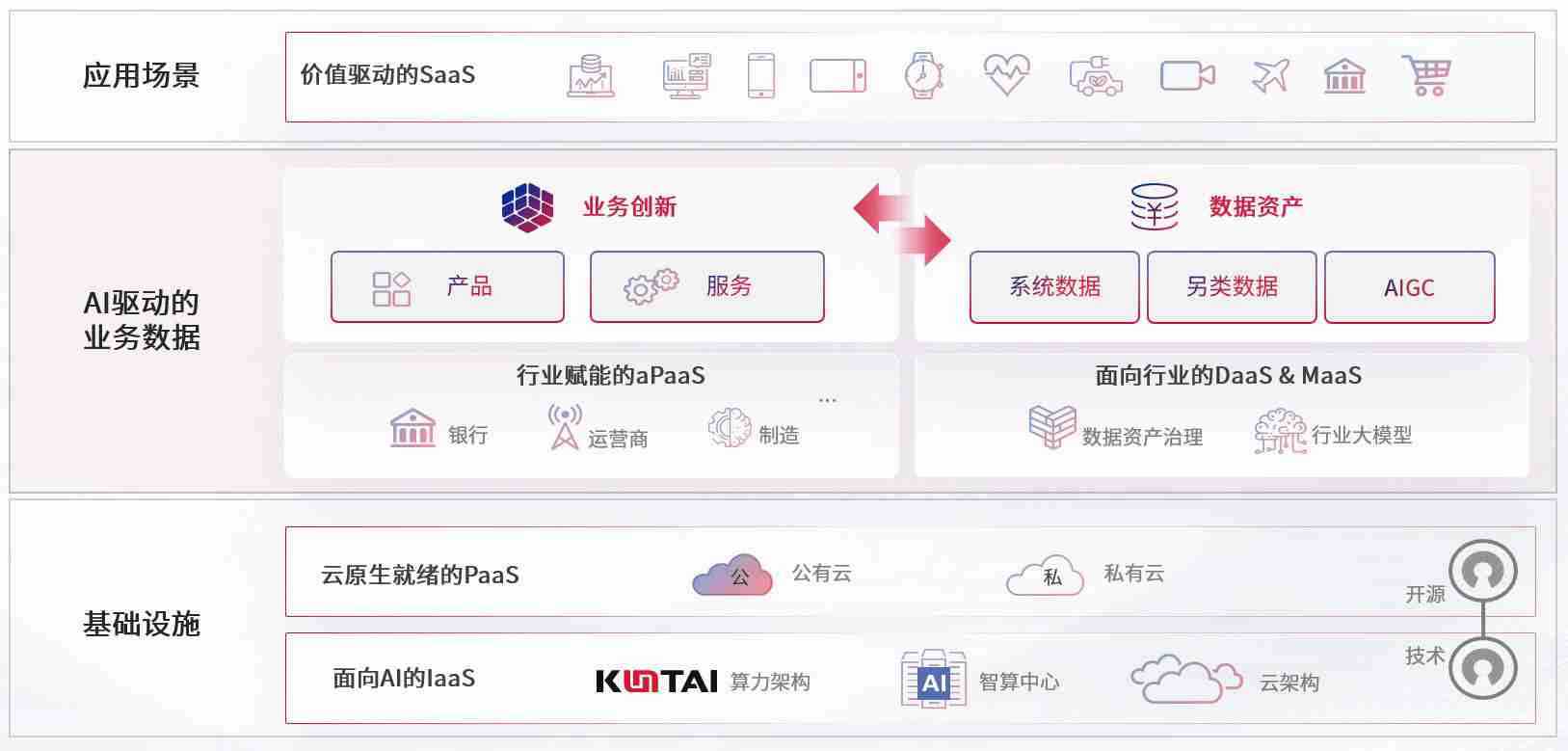 数字时代,,围绕企业数字化转型的关键要素,,PA旗舰厅数码开创性的提出数云融合战略和技术体系框架,,着力在云原生、、、数字原生、、、AI原生和信创产业上架构产品和服务能力,,,为处在不同数字化转型阶段的快消零售、、汽车、、金融、、医疗、、、、政企、、教育、、运营商等行业客户提供泛在的敏捷IT能力和融合的数据驱动能力,,,,构建跨界融合创新的数字业务场景和新业务模式,,,,助力企业级客户建立面向未来的核心能力和竞争优势,,,,全面推动社会的数字化、、、智能化转型升级。。。。