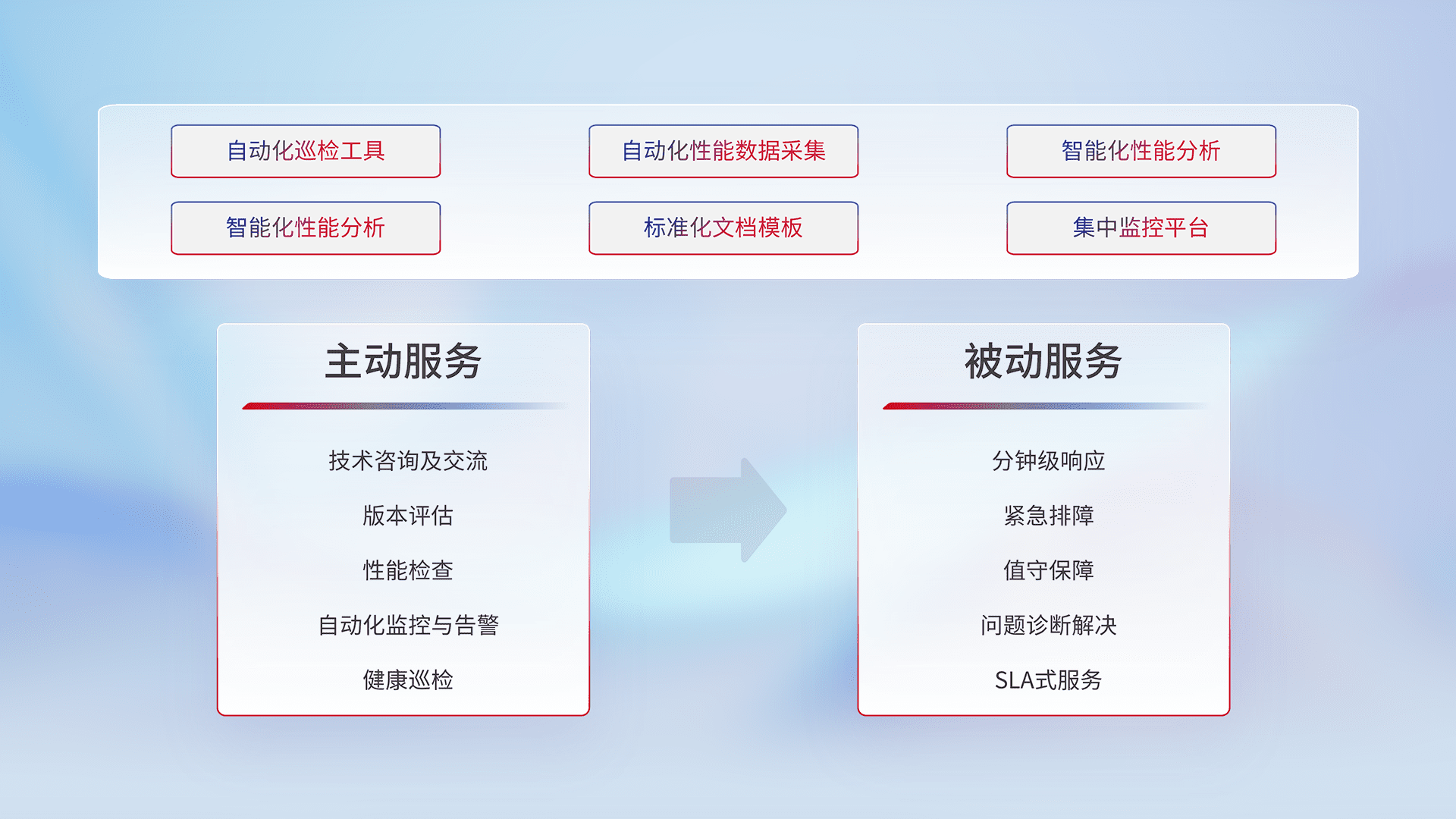 智能化工具和标准化文档,,,,保障服务质量,,,提供主动服务(包含技术咨询、、版本评估、、性能检查、、、自动化监控与告警、、健康巡检)和被动服务包含(分钟级响应、、、紧急排障、、值守保障、、问题诊断解决、、、、SLA服务)。。